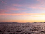 Hommikuti on taevas lillakas-roosa ja vesi enamasti