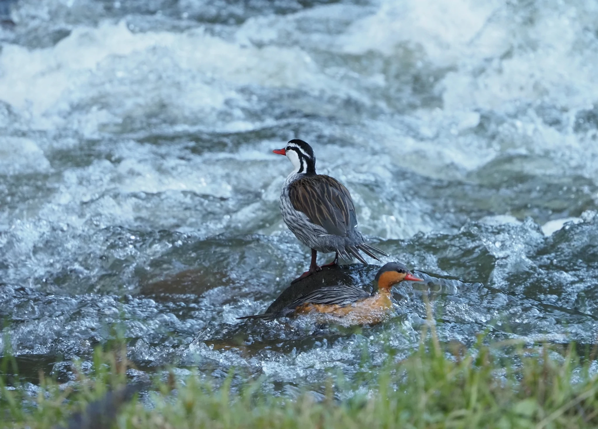 Kitsal mägijõel kalastab andi kosepartide paar. Sukelduvad kordamööda kiiresse voolu ja vupsavad veidi eemal jälle veest välja.